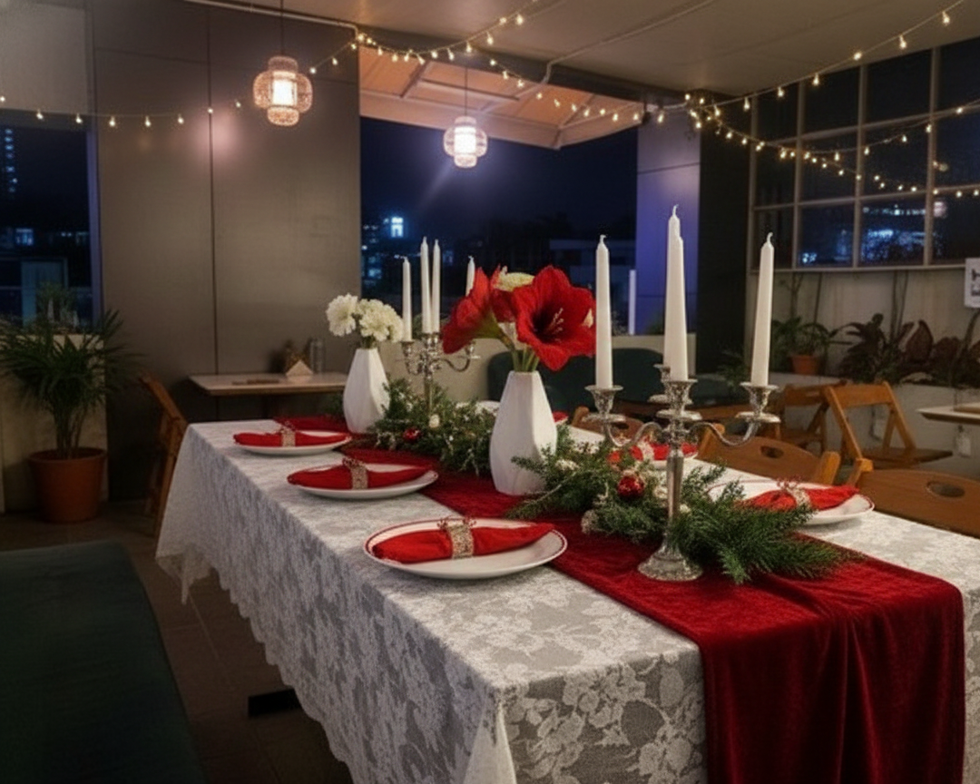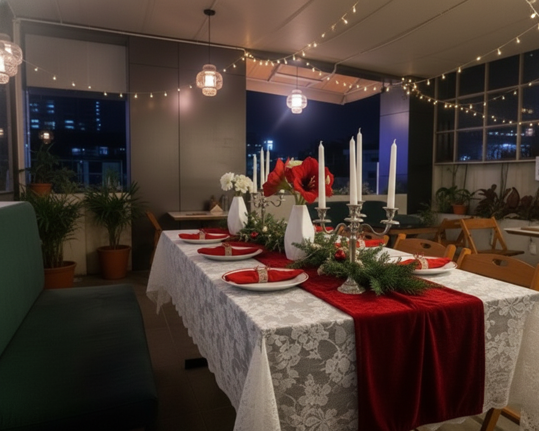 The Atmosphere: A festive, high-design setting curated to feel like a sophisticated holiday sanctuary.